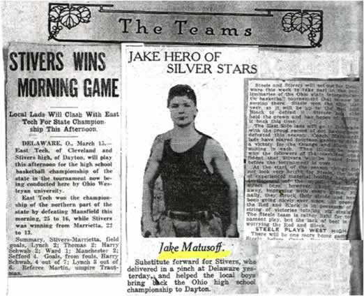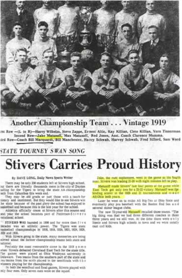 Jake was a small man in stature at 5’5″ and 128 lbs.. However, he loomed large on the basketball court and the baseball field. He was a member of the basketball team that won 22 straight games and 72 out of 75 in a three year span for Stivers. In 1919, with only 4 players on the floor due to fouls, Jake, a sophomore. scored the last 4 points for a 25-22 victory and the State Title. Jake was the leading scorer in 1920 & 1921 at the State Tournaments giving the Stivers team three straight State Championships. Jake was All-Ohio in 1920 & 1921. He graduated from Ohio State University where he excelled in both basketball and baseball. After graduation he was signed by the Boston Red Sox but a back and arm injury cut his career short. Jake worked for a successful insurance agency, married his wife, Freda, and had 2 children, Joyce and Marty, 5 grandchildren and 9 great grand-children.