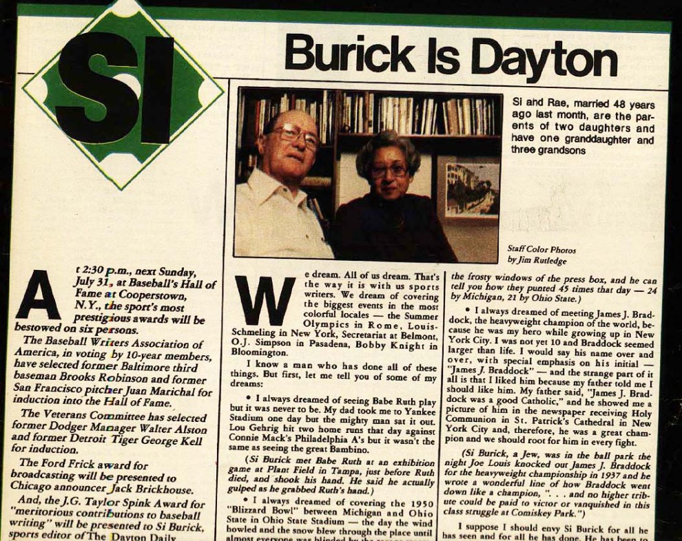 Si was born in Dayton on June 14, 1909, the son of Rabbi Samuel F. Burick & Lillian Buick. While a 16 year old student at Stivers, he began his illustrious career at the Dayton Daily News as a $2-a-week school correspondent. After graduating from Stivers, he enrolled at the University of Dayton with his sights set on medical school. However, James M. Cox, publisher, appointed him sports editor and he held that position for the remainder of his career.
