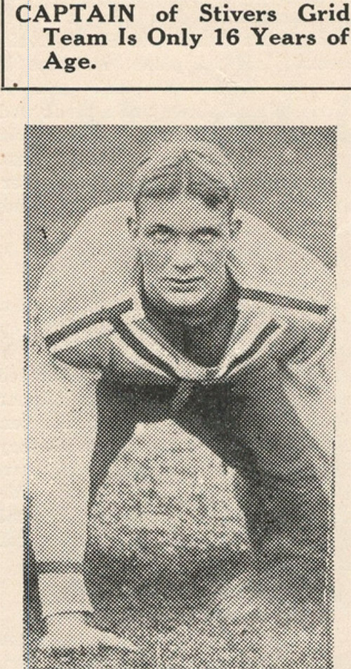 Carl “Rube” Woxman was a unanimous first team All-City tackle for Stivers High School from 1927-1929. He was named the captain of the football team when he was sixteen years old. He was the youngest player to captain a team in any sport at that time. He was named to the All-Scholastic Eleven by the news in 1926 and 1927. He also ran track at Stivers before devoting all his time to football.