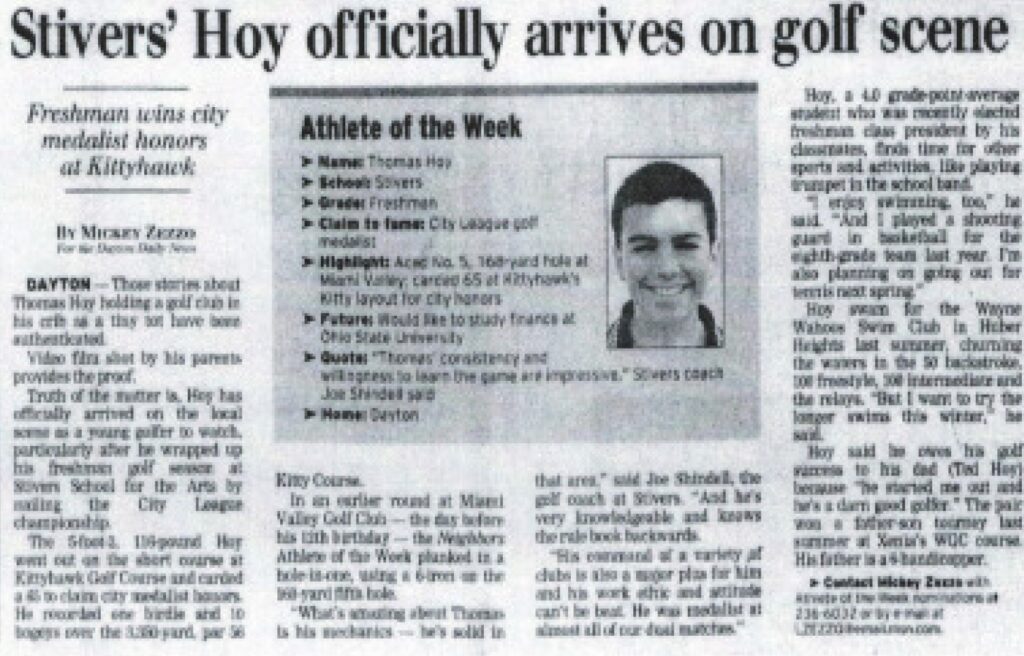 Thomas Hoy was one of the best golfers to ever play for the Stivers School For The Arts. Not only was he a terrific golfer, but he was also a scholar athlete, swam for the Tiger swim team, played the trumpet in the Stivers National Champion jazz orchestra and the Muse Machine.